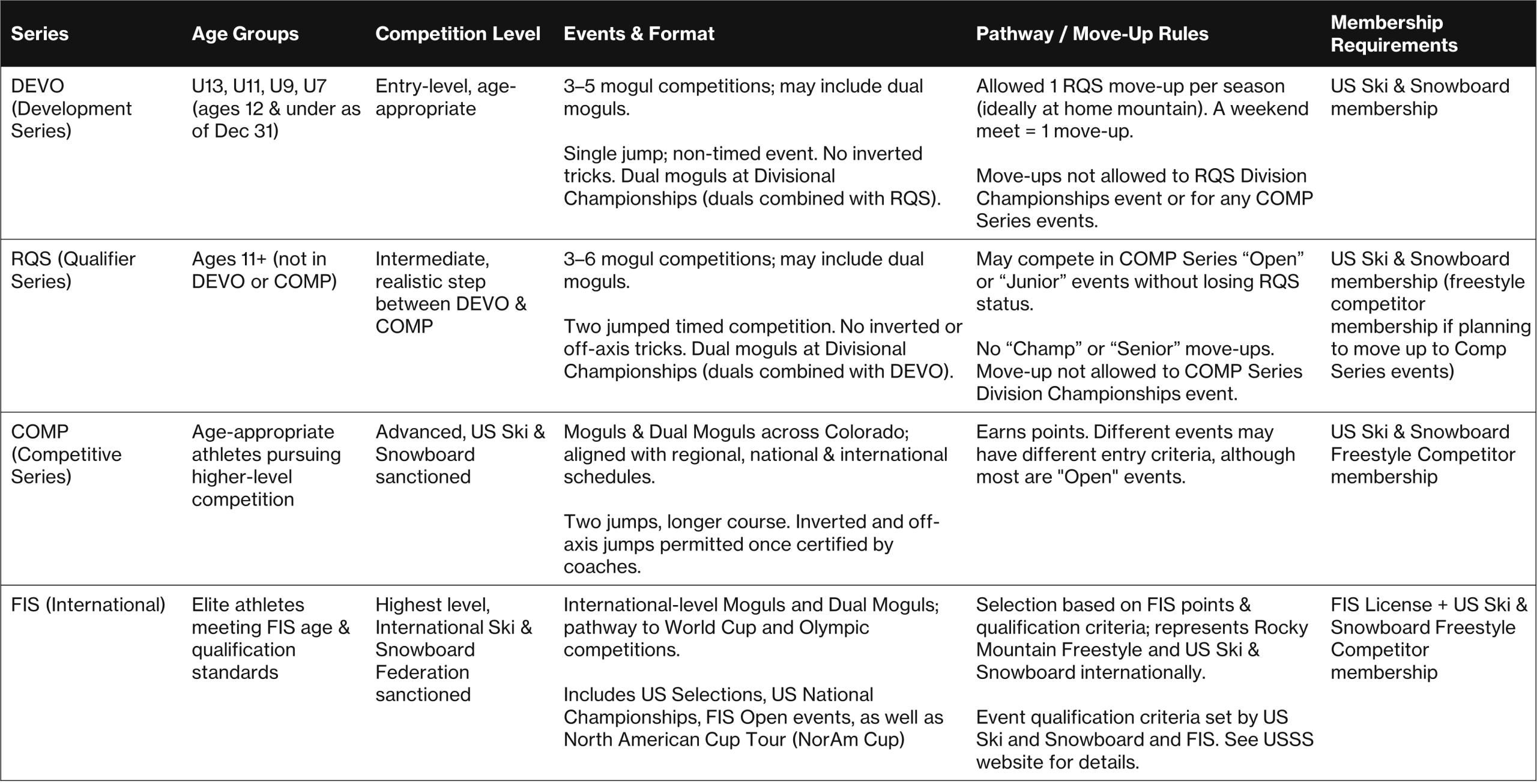The FIS level is the highest stage of freestyle competition for RMF athletes, where elite athletes represent Rocky Mountain Freestyle on the international stage. These events are sanctioned by the International Ski & Snowboard Federation (FIS) and serve as the pathway to World Cup and Olympic competition. Athletes at this level showcase the highest degree of skill, performance, and professionalism.